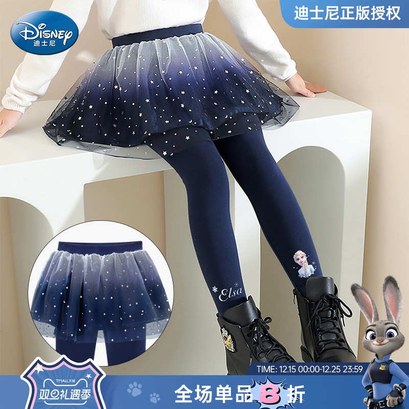 迪士尼女童加绒假两件裙裤仙气网纱拼接蛋糕裙打底裤25冬新款正品