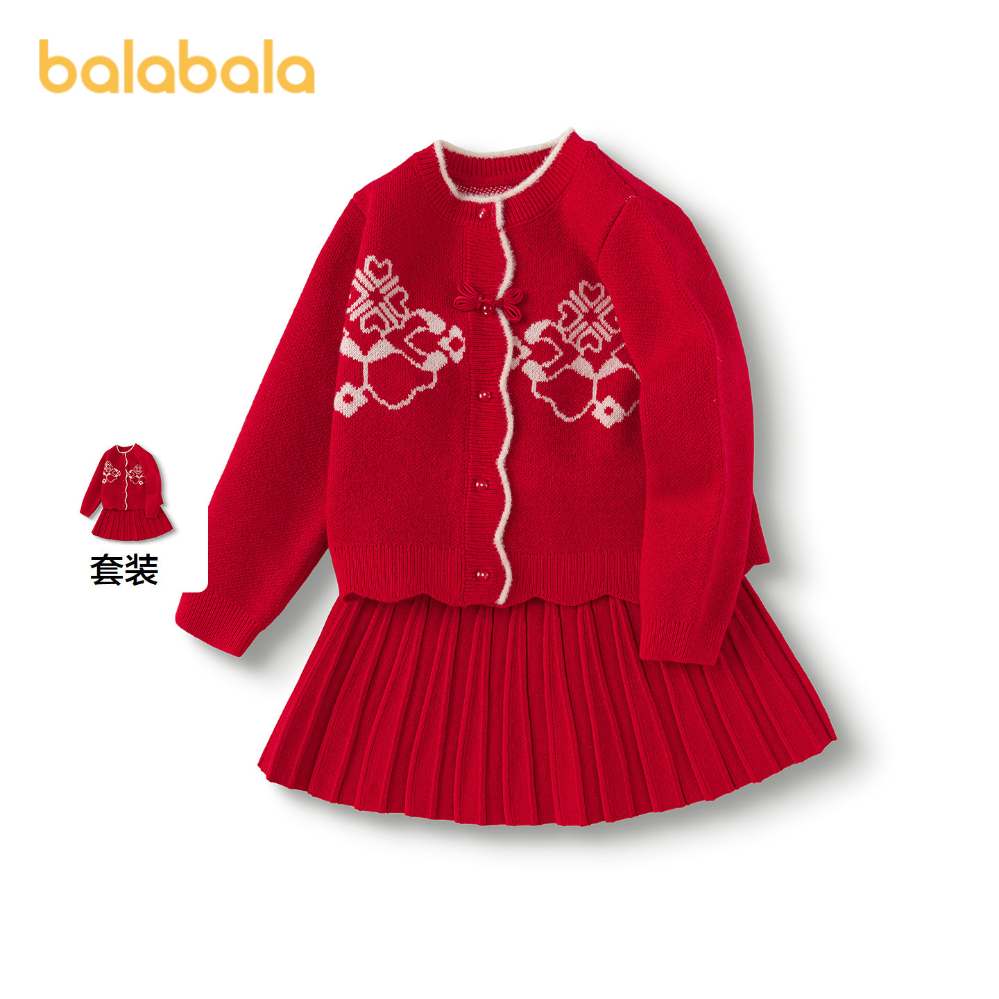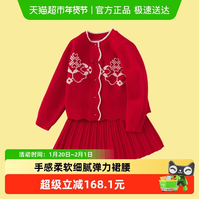 巴拉巴拉女童短裙套装大童红色开衫儿童新年款百褶裙春装新款童装