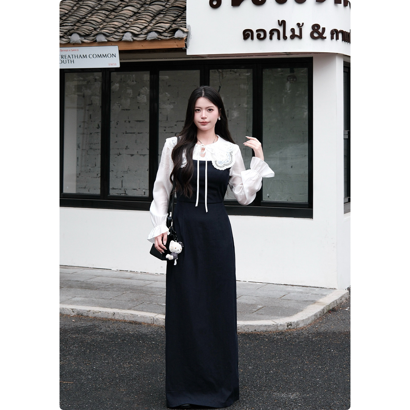 金苏一 黑色公主裙2026春秋新款韩版加厚拼接长裙chic气质连衣裙
