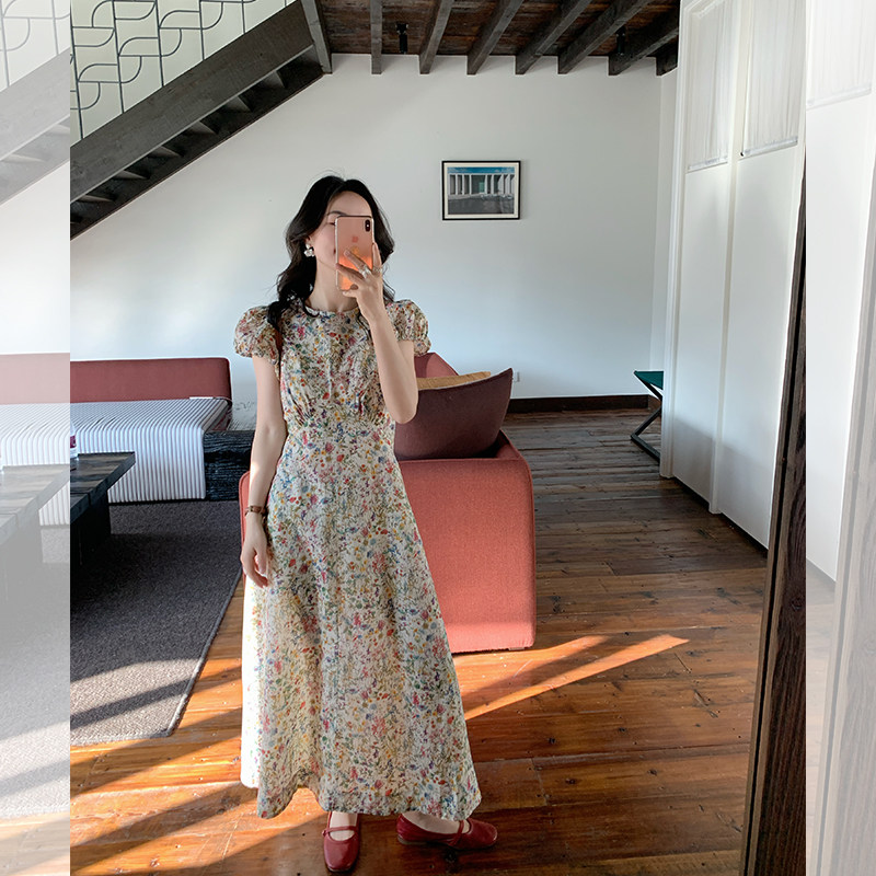 金苏一 天丝亚麻小花连衣裙2025夏季韩版收腰短袖长裙chic裙子潮