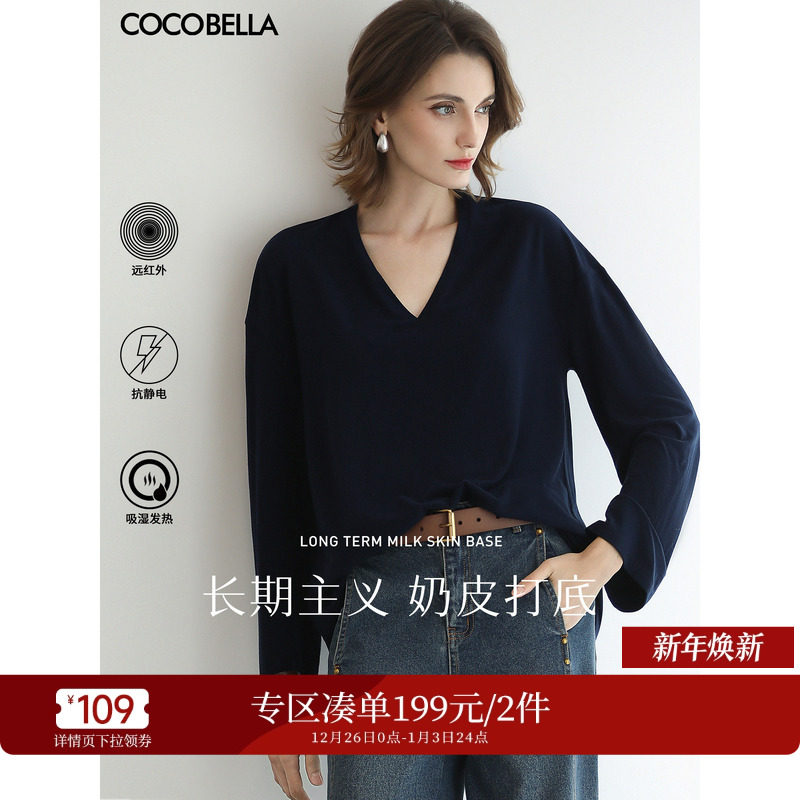 COCOBELLA抗静电保暖V领长袖T恤女秋冬吸湿发热打底衫UT0003