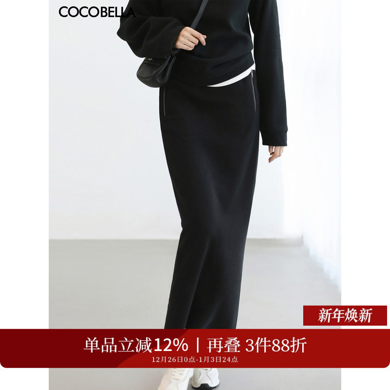 COCOBELLA时尚通勤黑色半身裙女秋冬自发热遮胯直筒裙HS3162