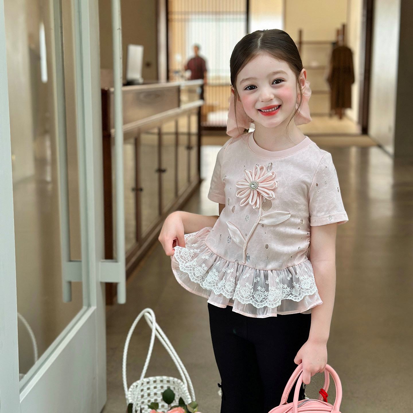 女宝宝蕾丝短袖T恤 2024夏装韩版新款女童童装 花边圆领儿童上衣