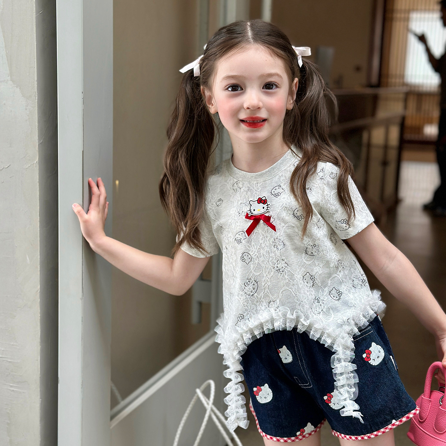栀了成长记女童装韩版可爱短袖上衣2026春季儿童蕾丝印花针织T恤