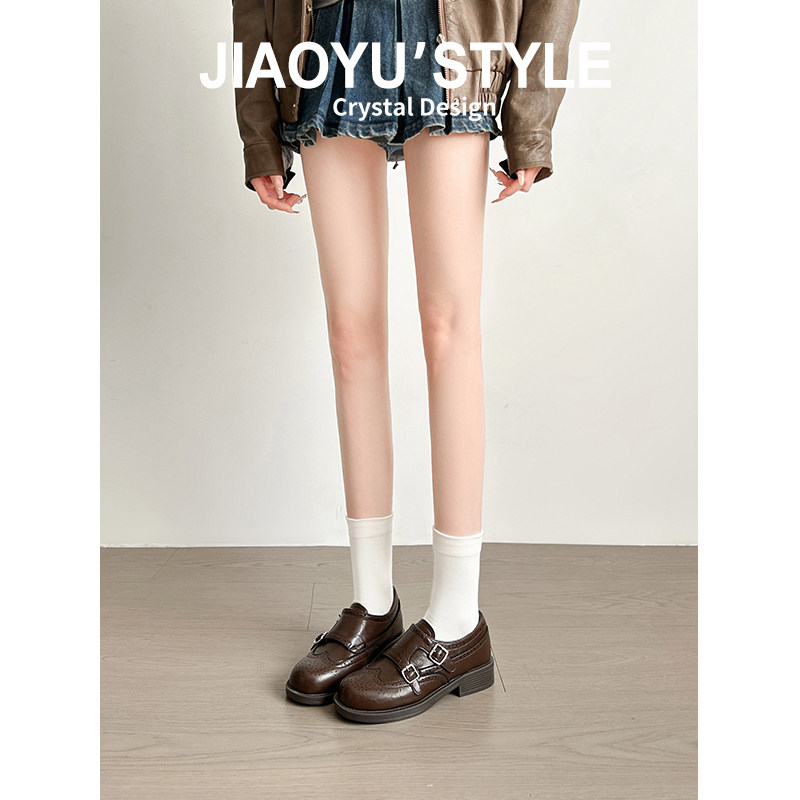 牛皮版~英伦风布洛克乐福鞋女2025新款黑色皮带扣厚底粗跟小皮鞋