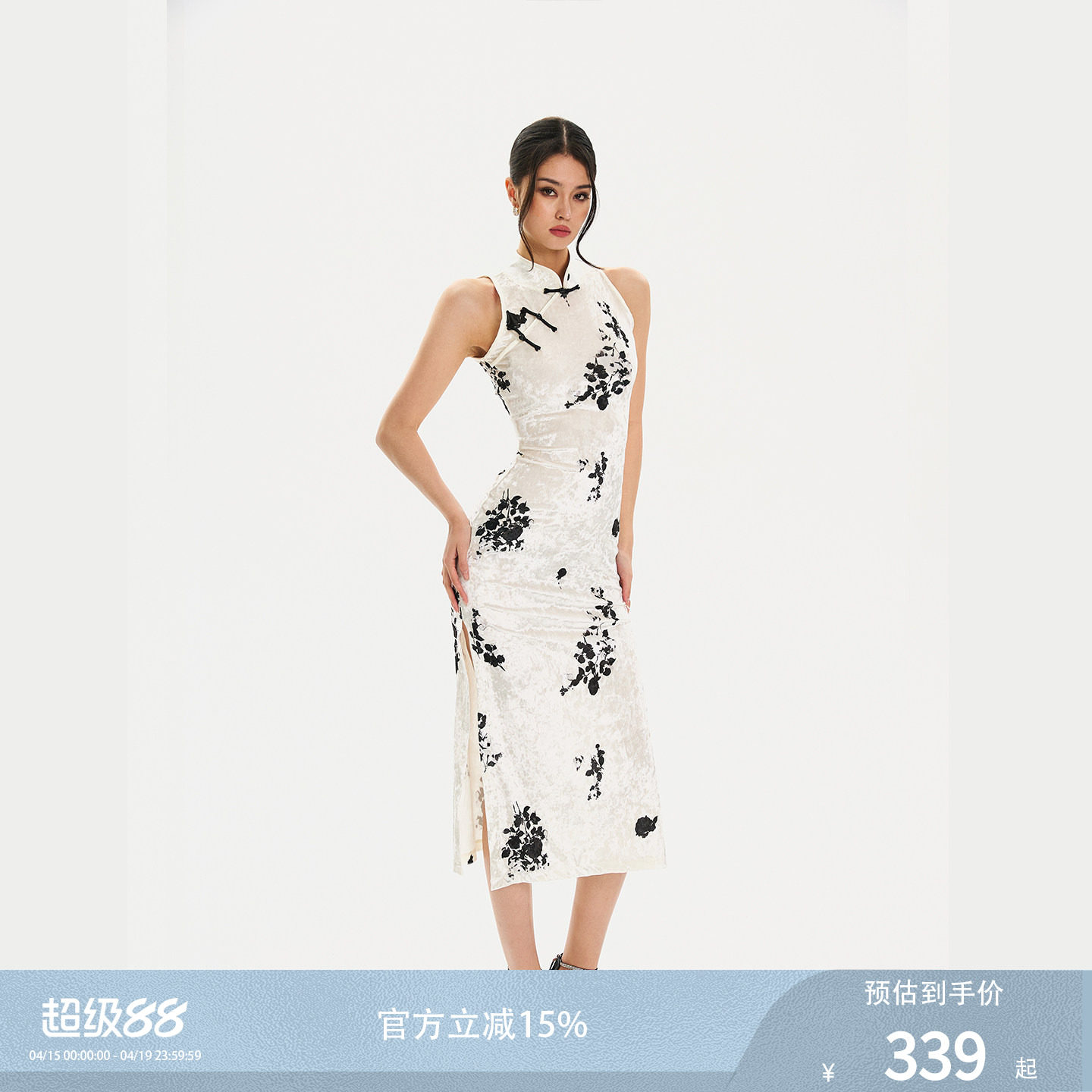 FINDYAWINGS《水墨江南》肌理丝绒高收腰水墨印花长款旗袍连衣裙