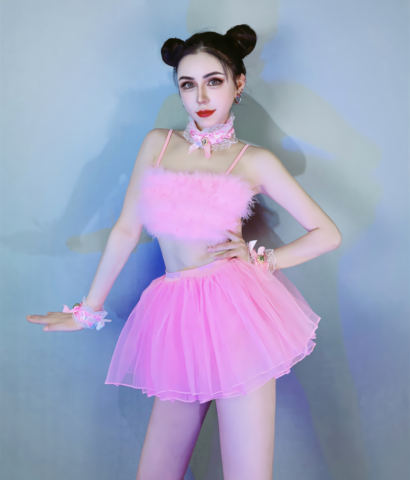 新品DS演出服女dj领舞服gogo秀派对气氛酒吧粉色羽毛蓬蓬裙套装