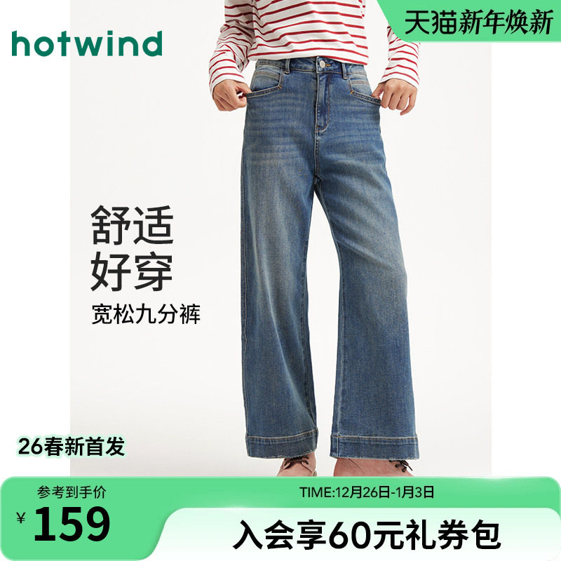 热风女士直筒牛仔裤2026年春季新款时尚宽松九分裤显瘦水洗阔腿裤