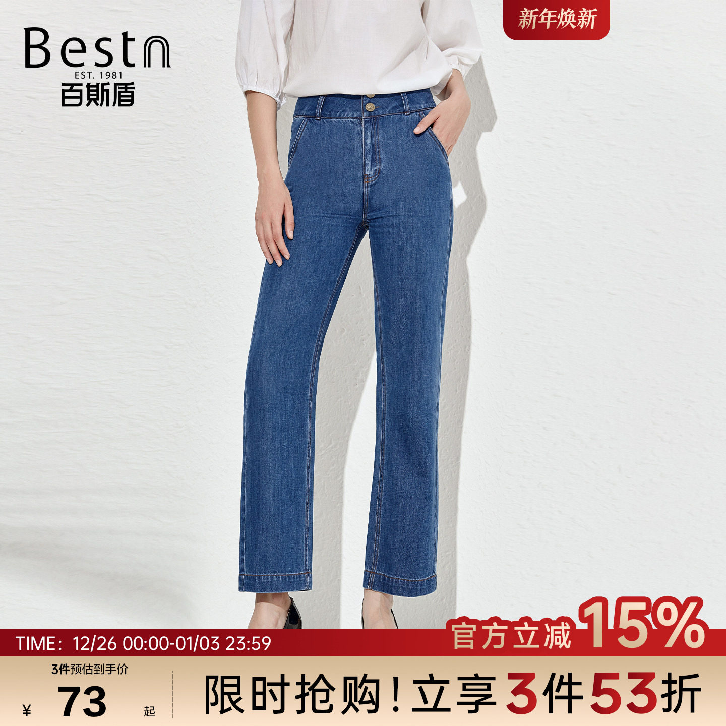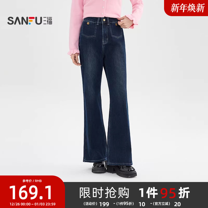 三福牛仔裤女2025新款冬季深蓝色微喇裤时尚显瘦长裤子女装512843