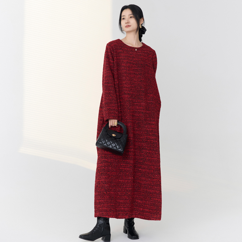 自制!高级复古红气质雪尼尔秋冬袍子连衣裙原创文艺宽松显瘦女装