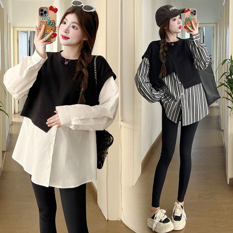 大码孕妇春装套装2024新款上衣设计感中长款假两件衬衫宽松200斤