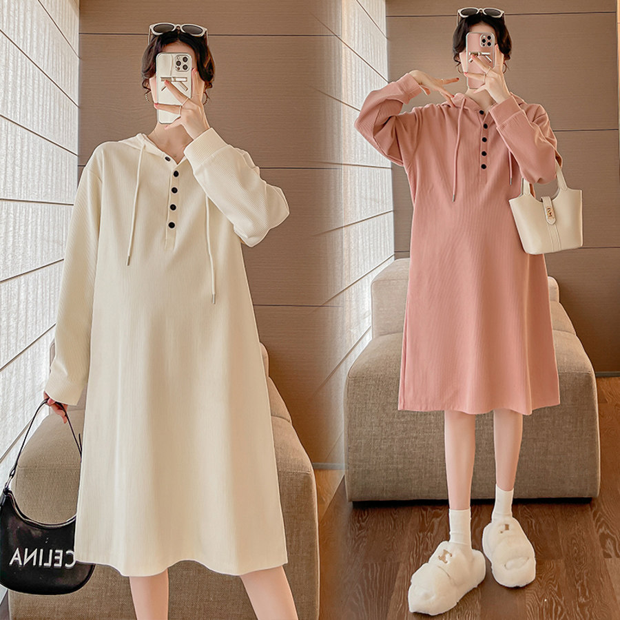 孕妇春装连衣裙2026新款宽松大码连帽过膝卫衣裙遮肚开叉春秋裙子