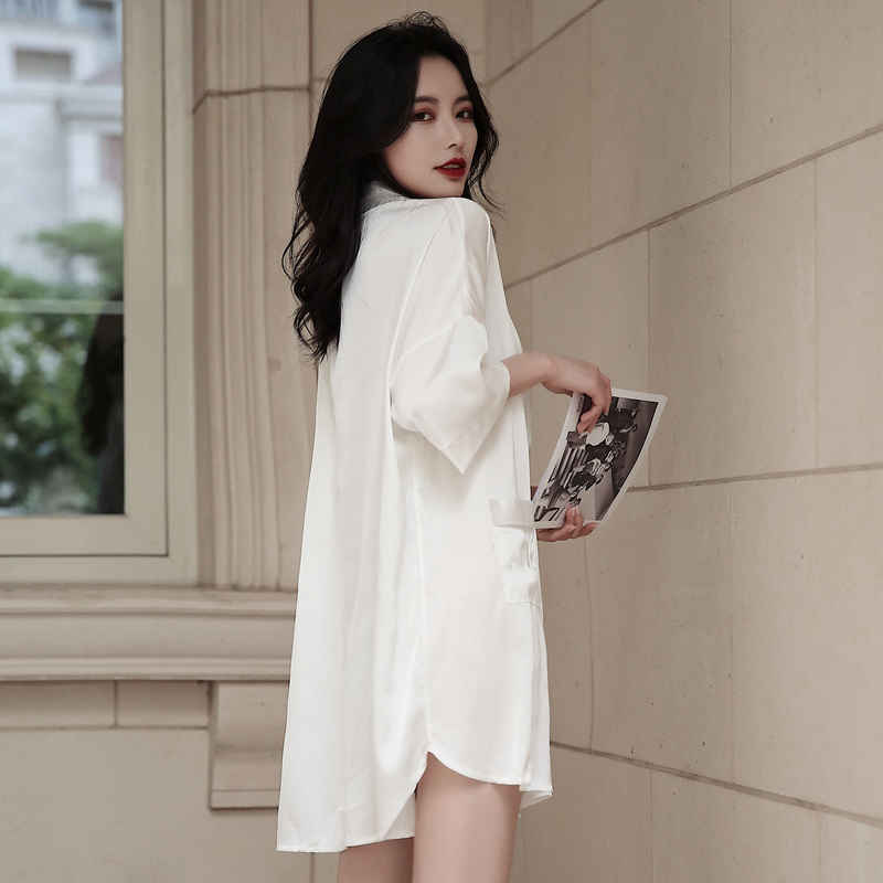 性感冰丝衬衫睡裙女春夏薄款纯欲男友风中长款丝滑白色开衫家居服
