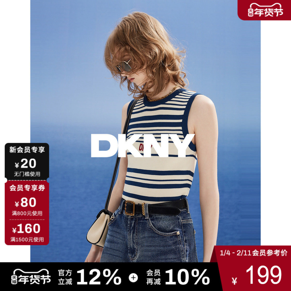 DKNY唐可娜儿春夏背心女针织内搭条纹撞色圆领上衣不规则刺绣内搭