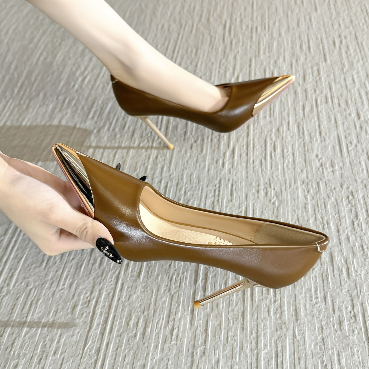 金属铁头豹纹细跟尖头高跟鞋女2026年秋冬新款小众设计感浅口单鞋