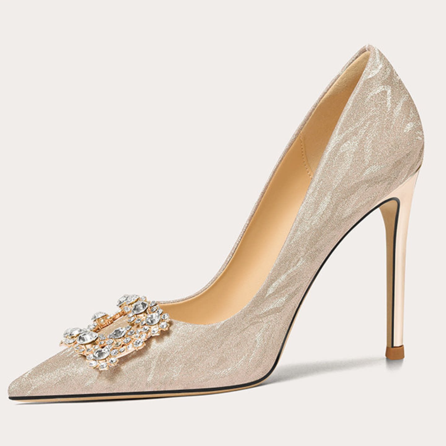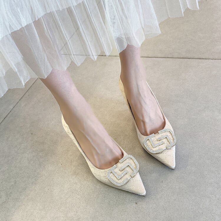 法式气质方扣水钻尖头高跟鞋女细跟秋冬小众设计感米白色婚纱婚鞋