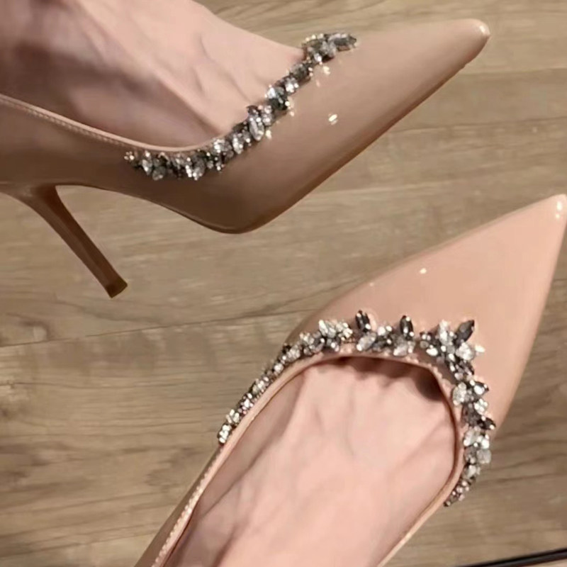 2026新款秋冬季裸色高跟鞋女细跟尖头水钻漆皮不累脚气质单鞋婚鞋