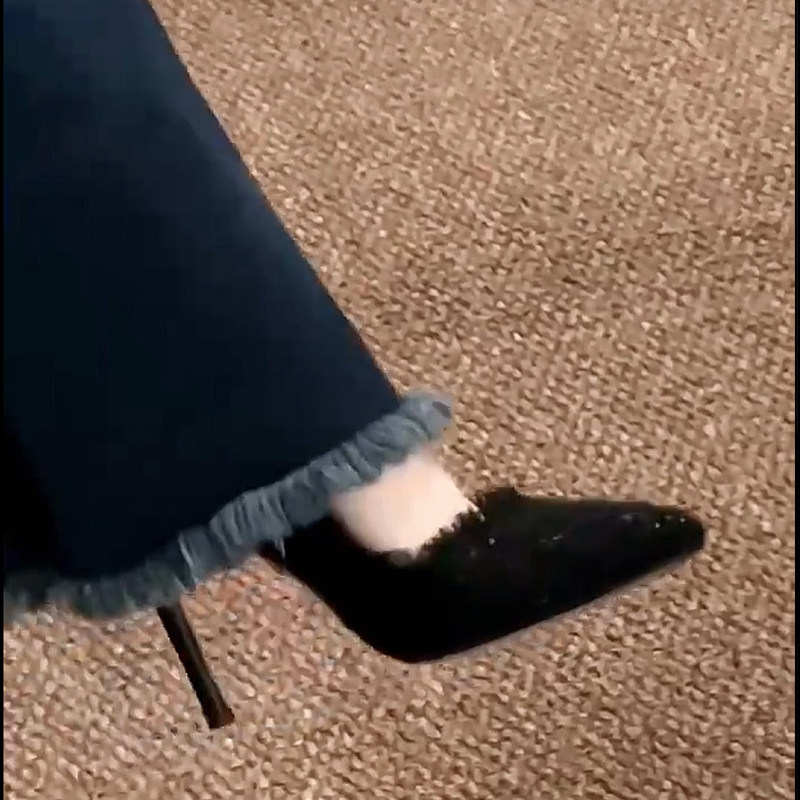 月芽儿绒面细跟宴会浅口秋冬黑色高跟鞋女尖头单鞋女名媛优雅气质