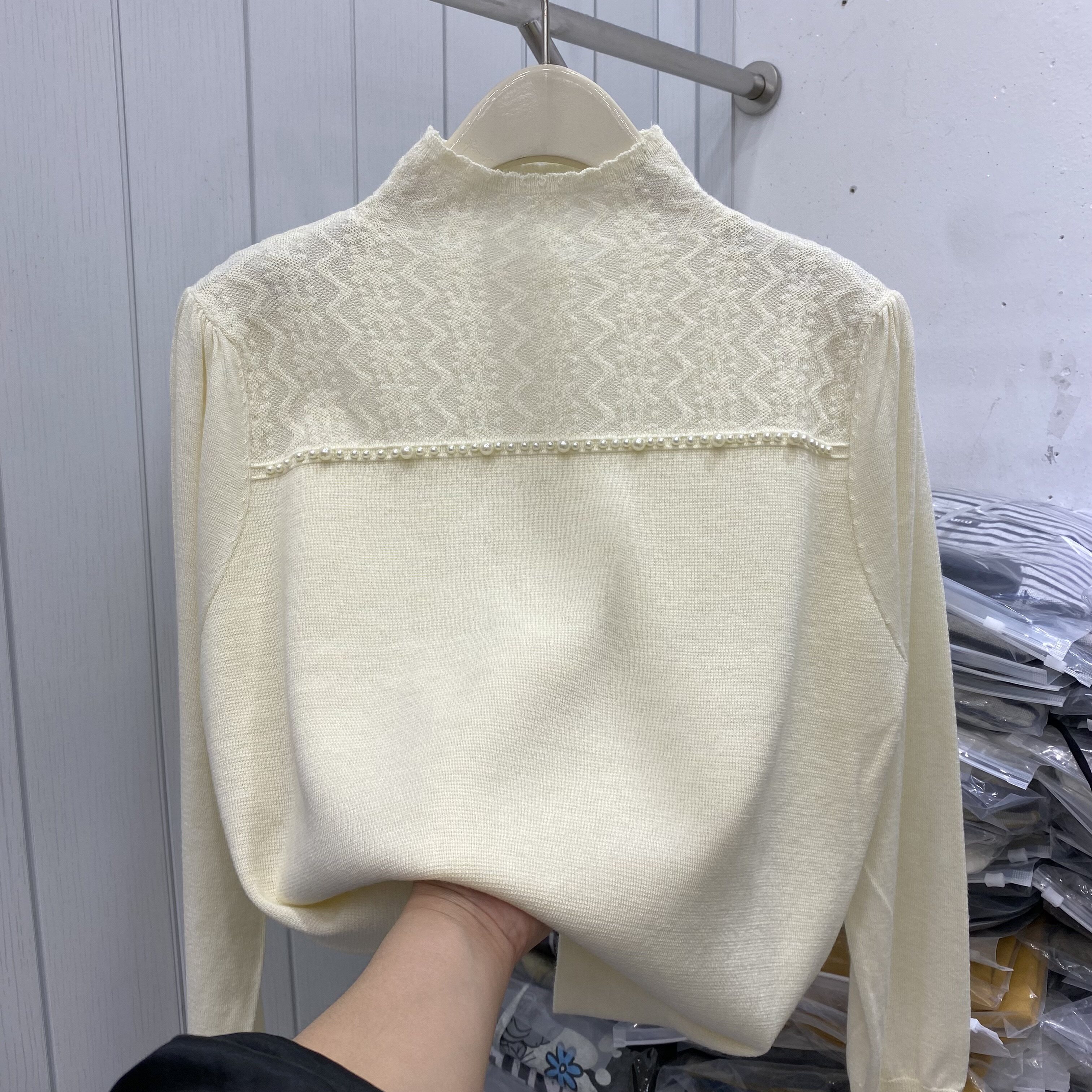 加绒半高领长袖蕾丝打底衫女秋冬新款法式气质内搭小衫显瘦上衣潮
