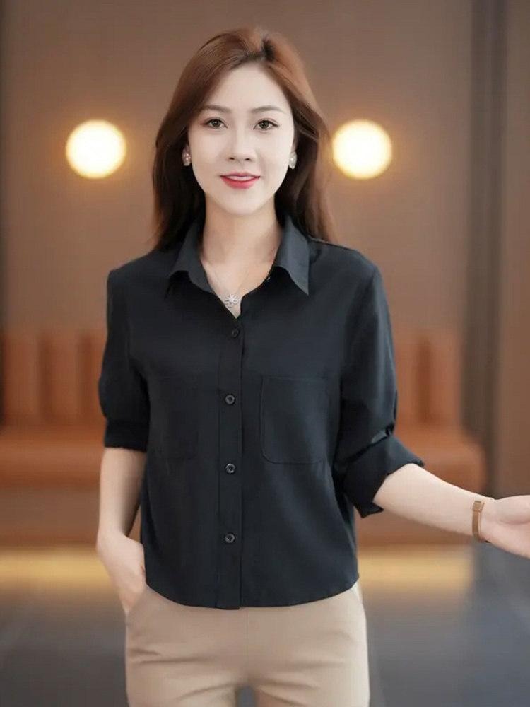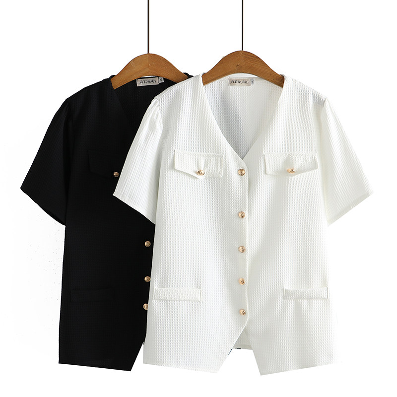 2023年夏季女装小衫复古小香风V领金属扣贴袋开叉短袖大码衬衫