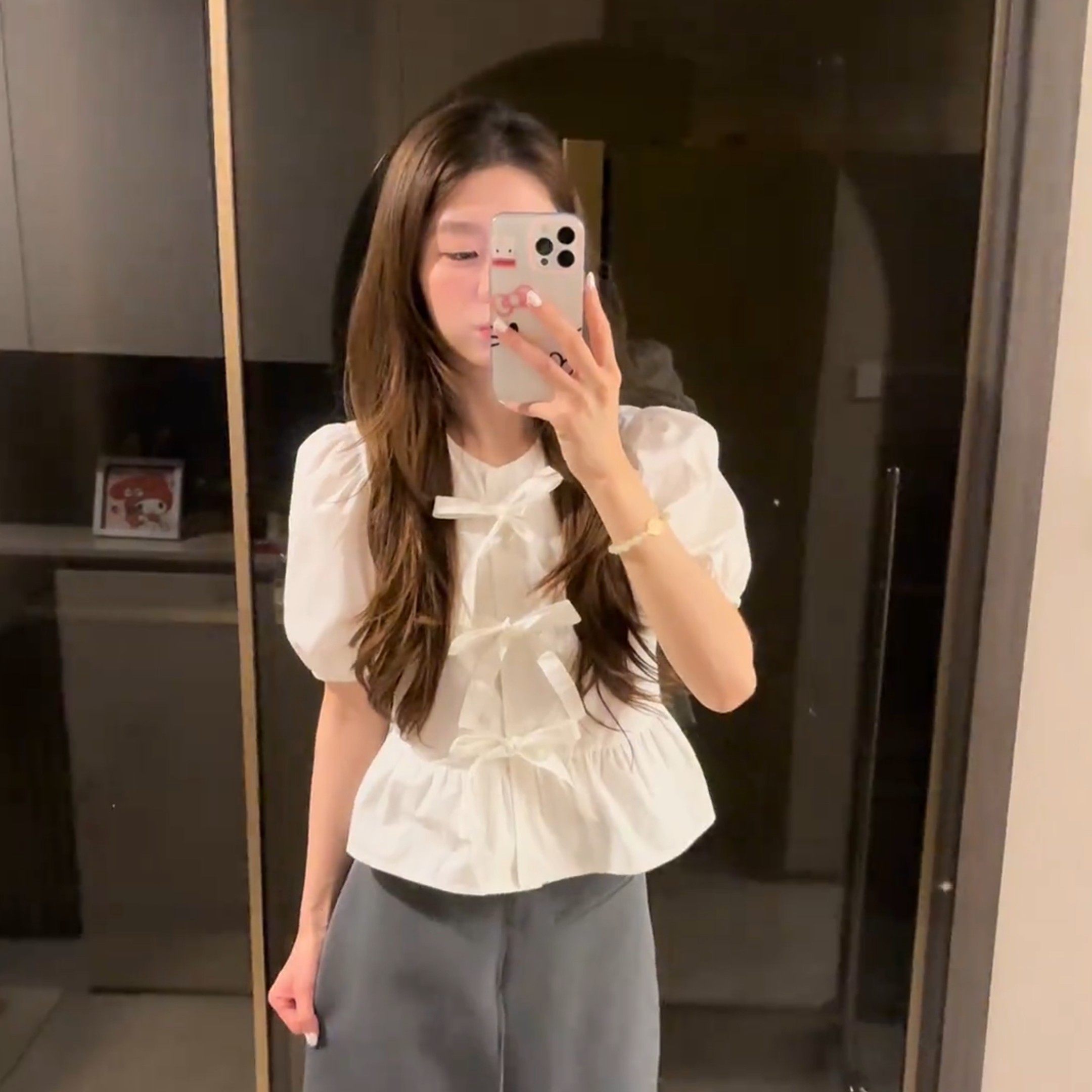 法式温柔风蝴蝶结系带短袖衬衫女夏季新款甜美减龄女装小衫上衣女