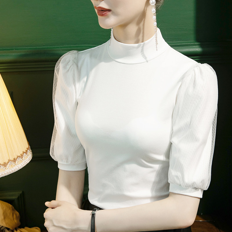 2024秋季纯棉半高领T恤女五分袖修身网纱拼接女装小衫中袖上衣
