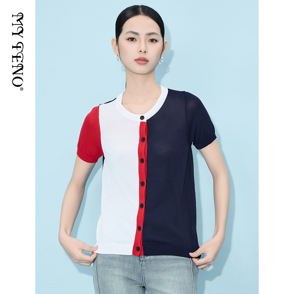 马天奴2025春夏新款藏青圆领拼色针织衫短袖上衣女装小衫时尚百搭