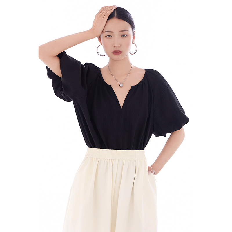 法式V领泡泡袖T恤女短袖修身2025秋季新款棉t女装小衫纯色上衣