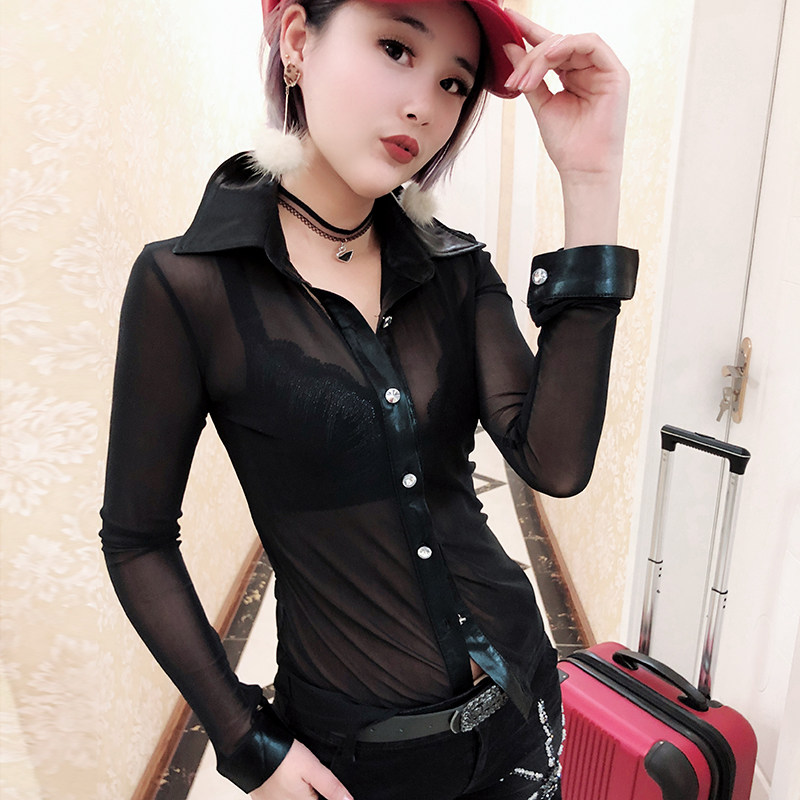 透视网纱翻领性感女装小衫女2024新款洋气打底衫时尚百搭长袖T恤