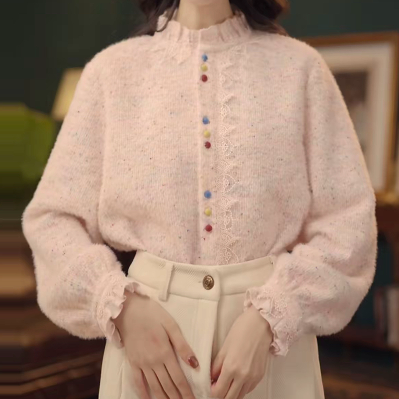 超好看花边领粉色衬衫女冬季设计感彩色扣子上衣秋冬百搭衬衫上衣