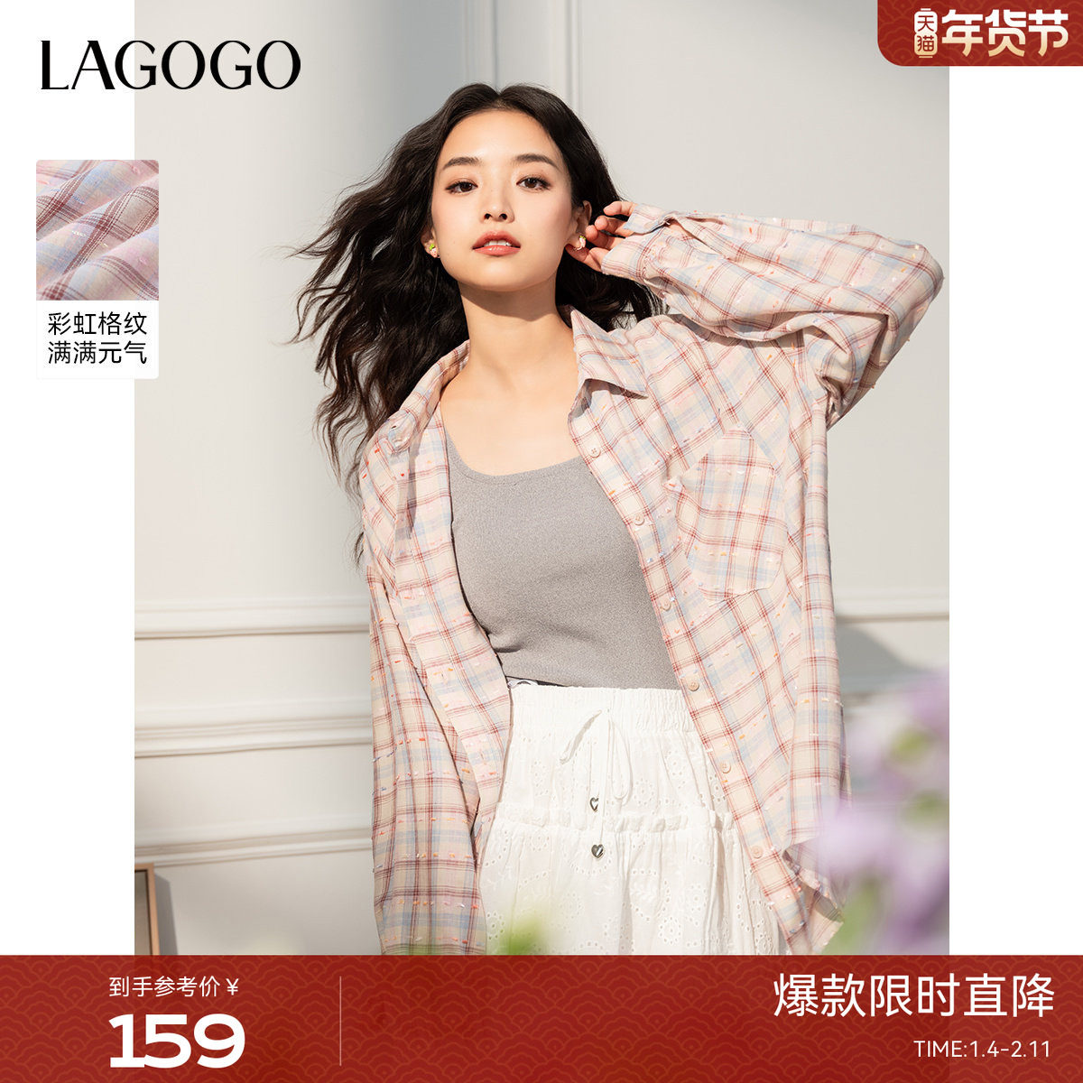LAGOGO彩虹格子粉色衬衫女拉谷谷2025秋冬新款薄外套宽松上衣