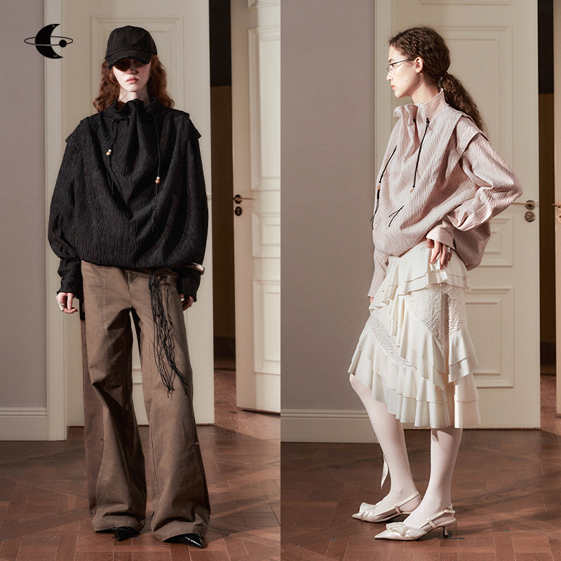 Basic House/百家好木耳边粉色衬衫女2026春季新款立领泡泡袖上衣