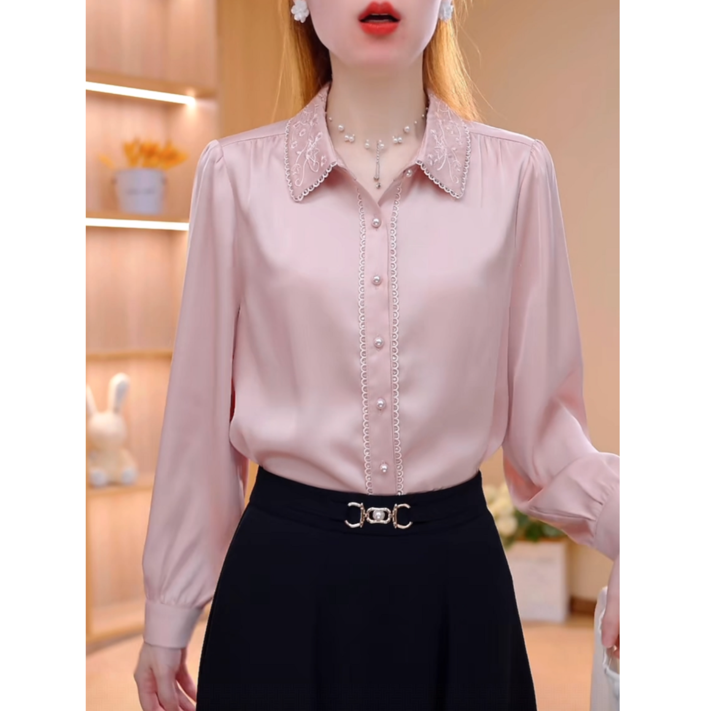 菲梦伊钉珠粉色衬衫女长袖秋装新款时尚简约百搭减龄气质职业上衣
