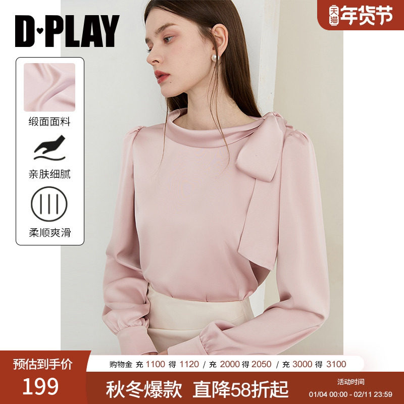 DPLAY2025年秋季新款粉色衬衫女蝴蝶结系带设计衬衣缎面长袖上衣