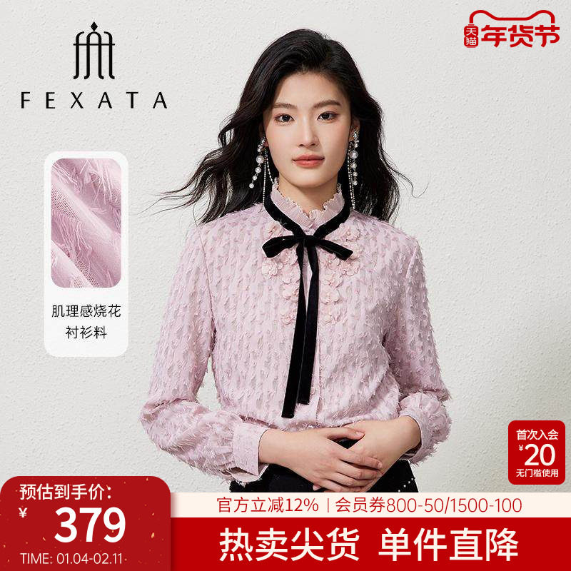 FEXATA斐格思2025冬季新品时尚气质系带领肌理感烧花粉色衬衫女