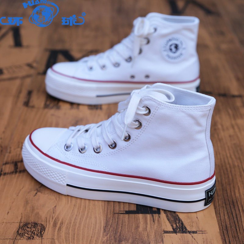 环球女鞋白色帆布鞋高帮女款休闲鞋子百搭厚底球鞋小白鞋增高板鞋