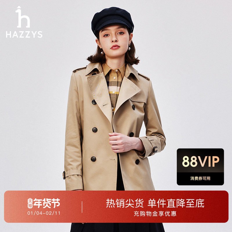 Hazzys哈吉斯短款双排扣风衣女士简约潮流时尚通勤秋季外套