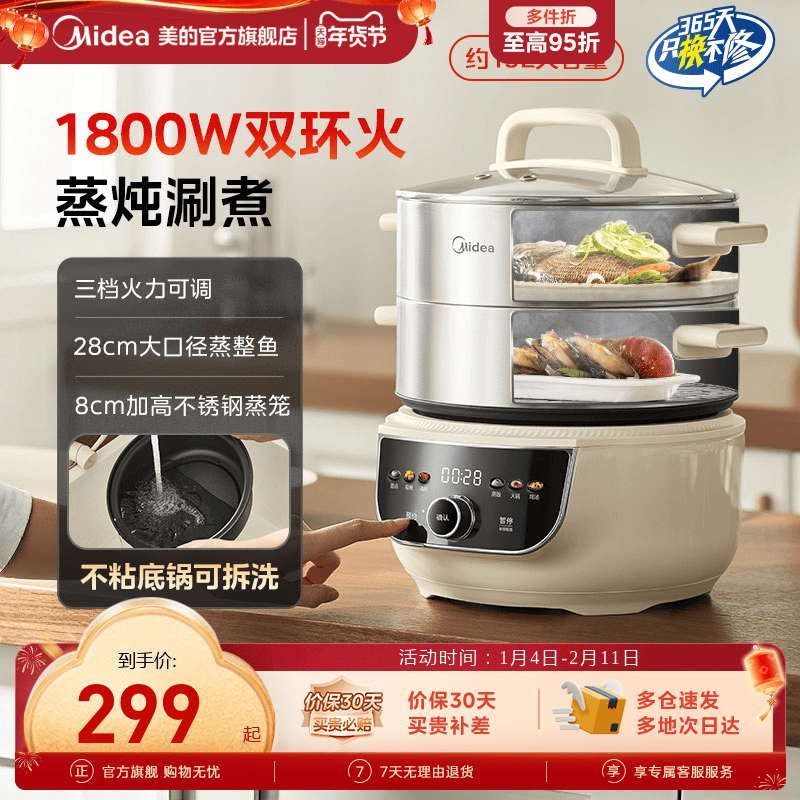 美的电蒸锅多功能蒸煮一体锅火锅煮锅家用不锈钢蒸汽锅蒸菜电蒸笼