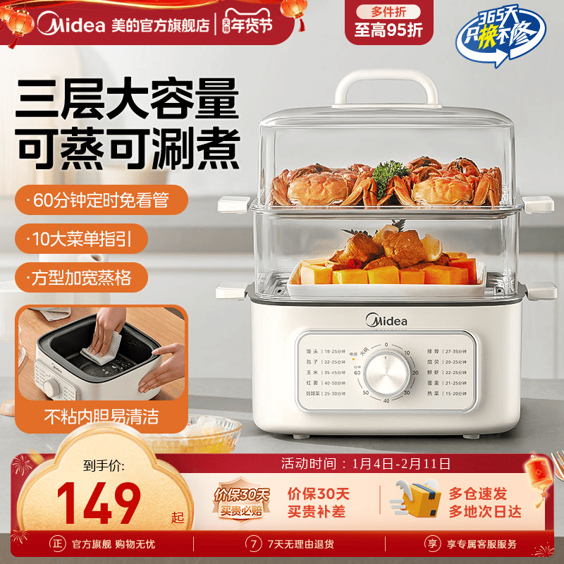 美的电蒸锅多功能家用电蒸笼蒸包子不锈钢三层大容量断电蒸菜神器