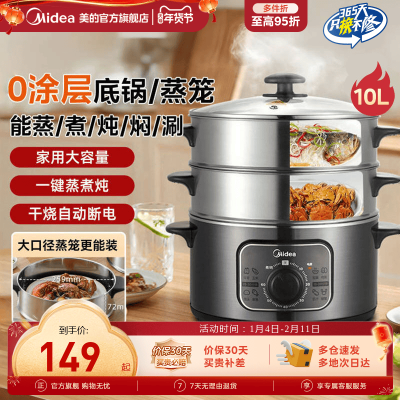美的电蒸锅多功能一体蒸锅火锅煮锅家用不锈钢蒸汽锅蒸菜电蒸笼箱