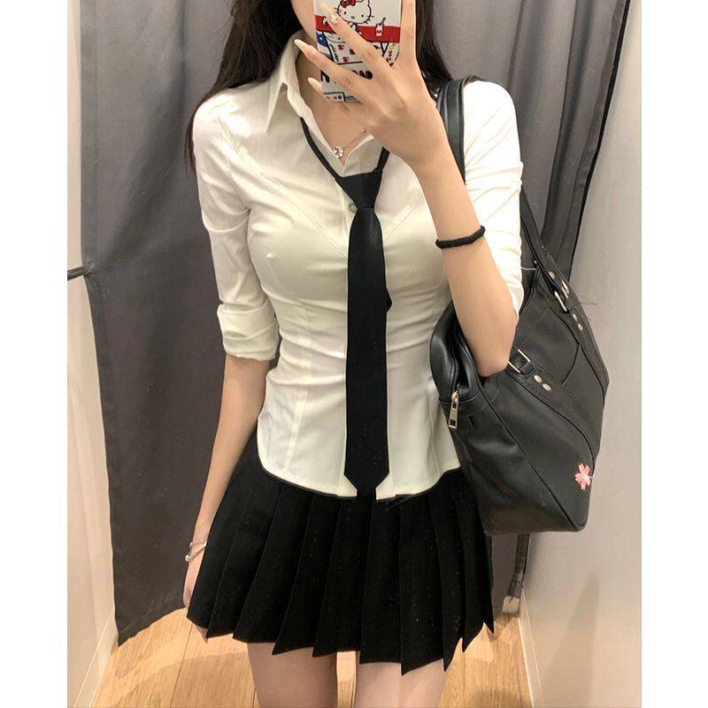 JK制服衬衫女短袖夏季修身白色衬衣学院风辣妹套装收腰灰长袖上衣