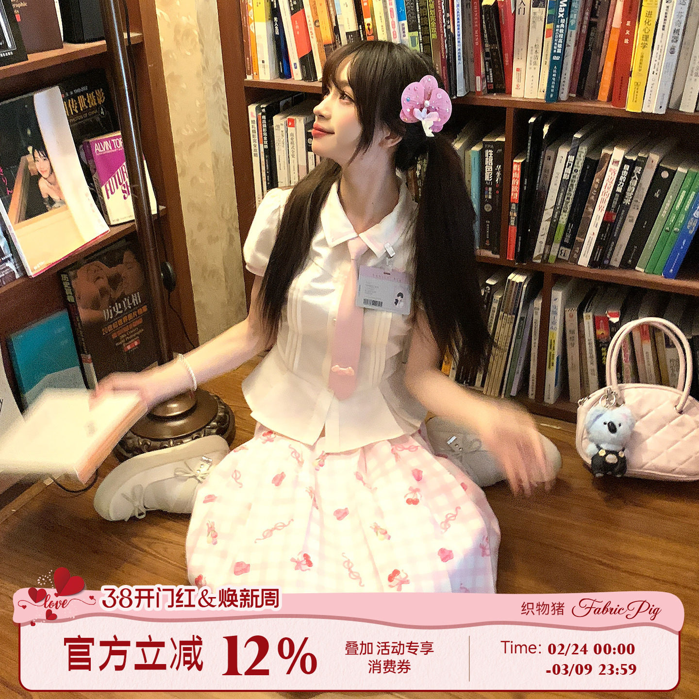 织物猪 美高甜心 甜美学院风JK制服衬衫套装女粉色印花格子半身裙