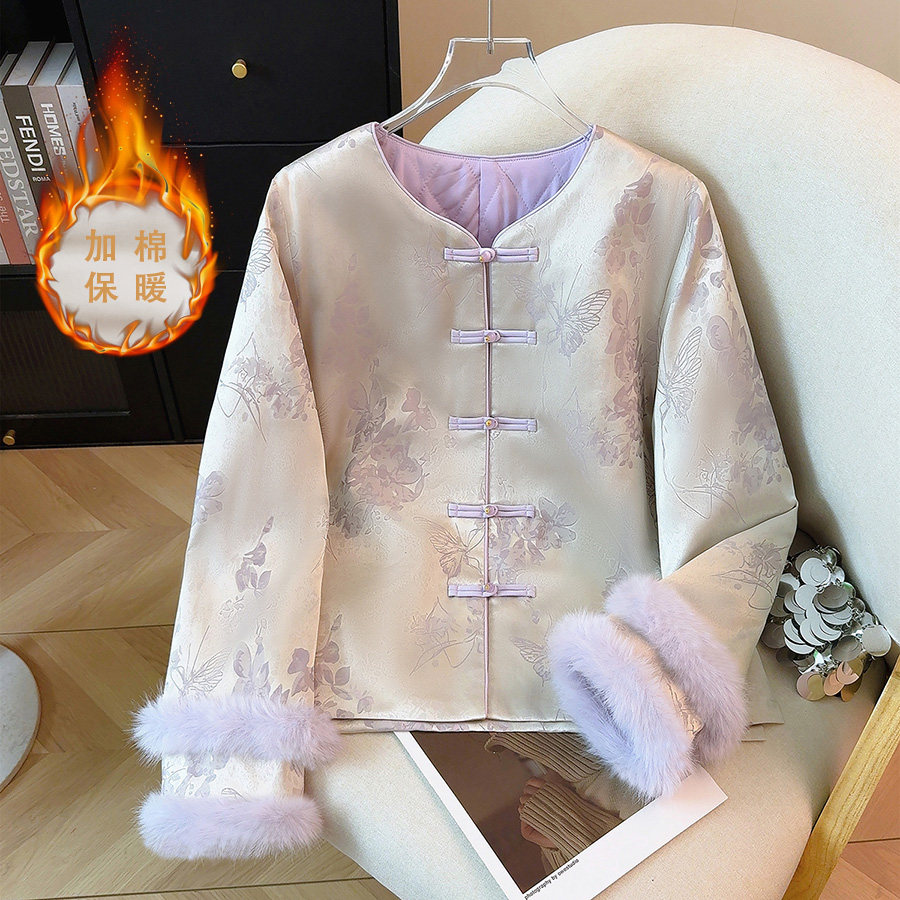实拍新中式民族风唐装加棉重工刺绣提花织锦复古长袖拼接棉服外套