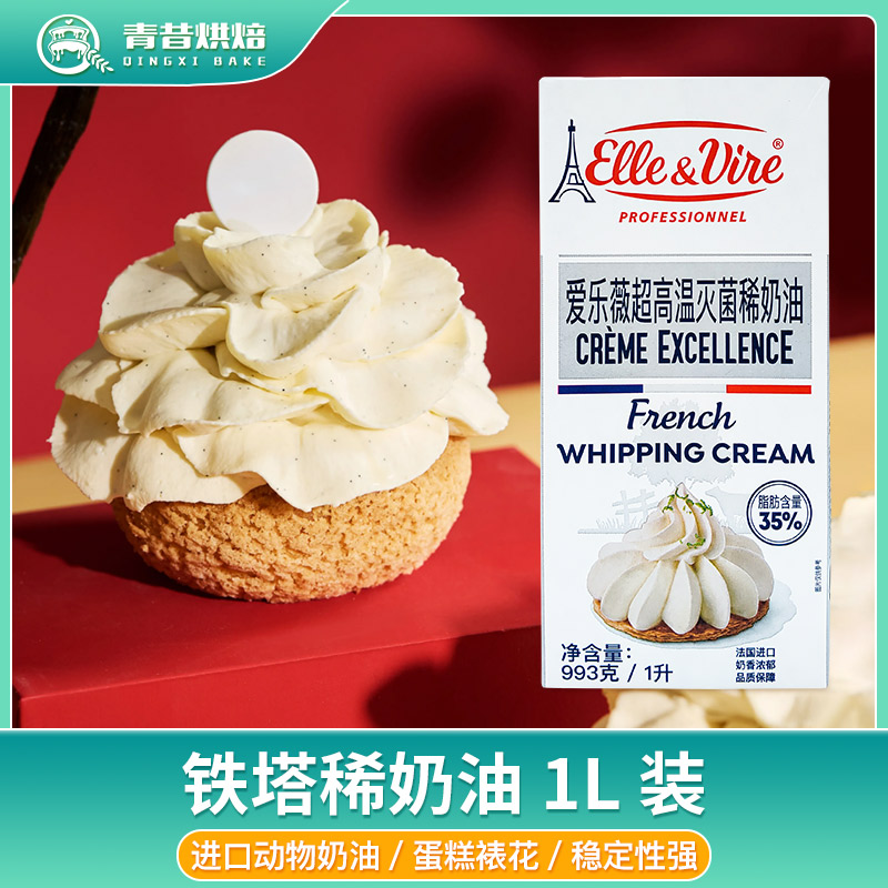 爱乐薇铁塔淡奶油1L法国进口动物性鲜稀奶油蛋糕裱花慕斯烘焙家用