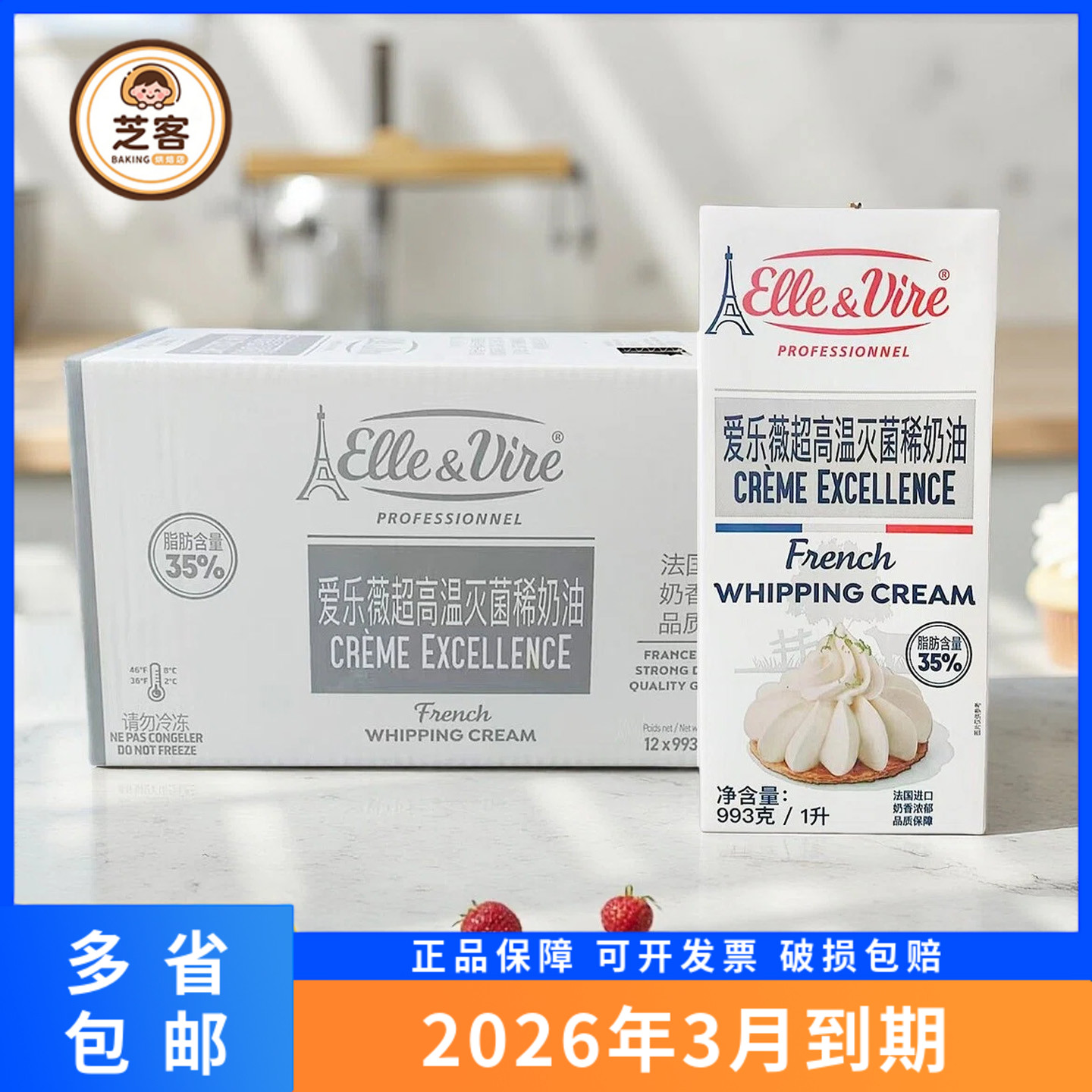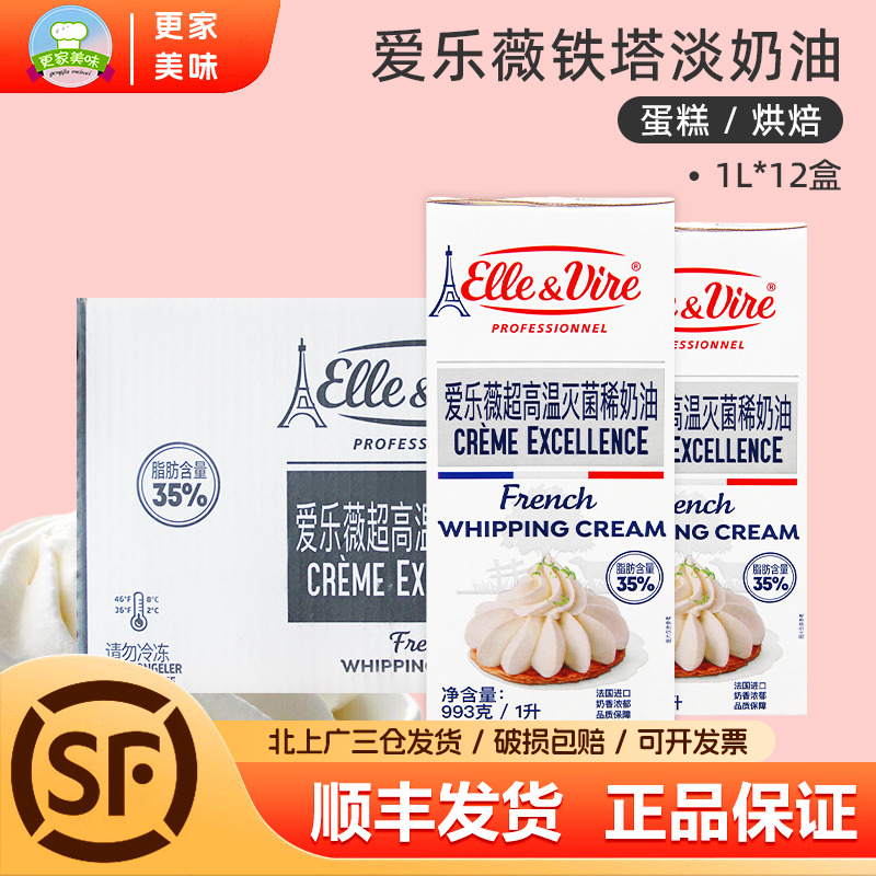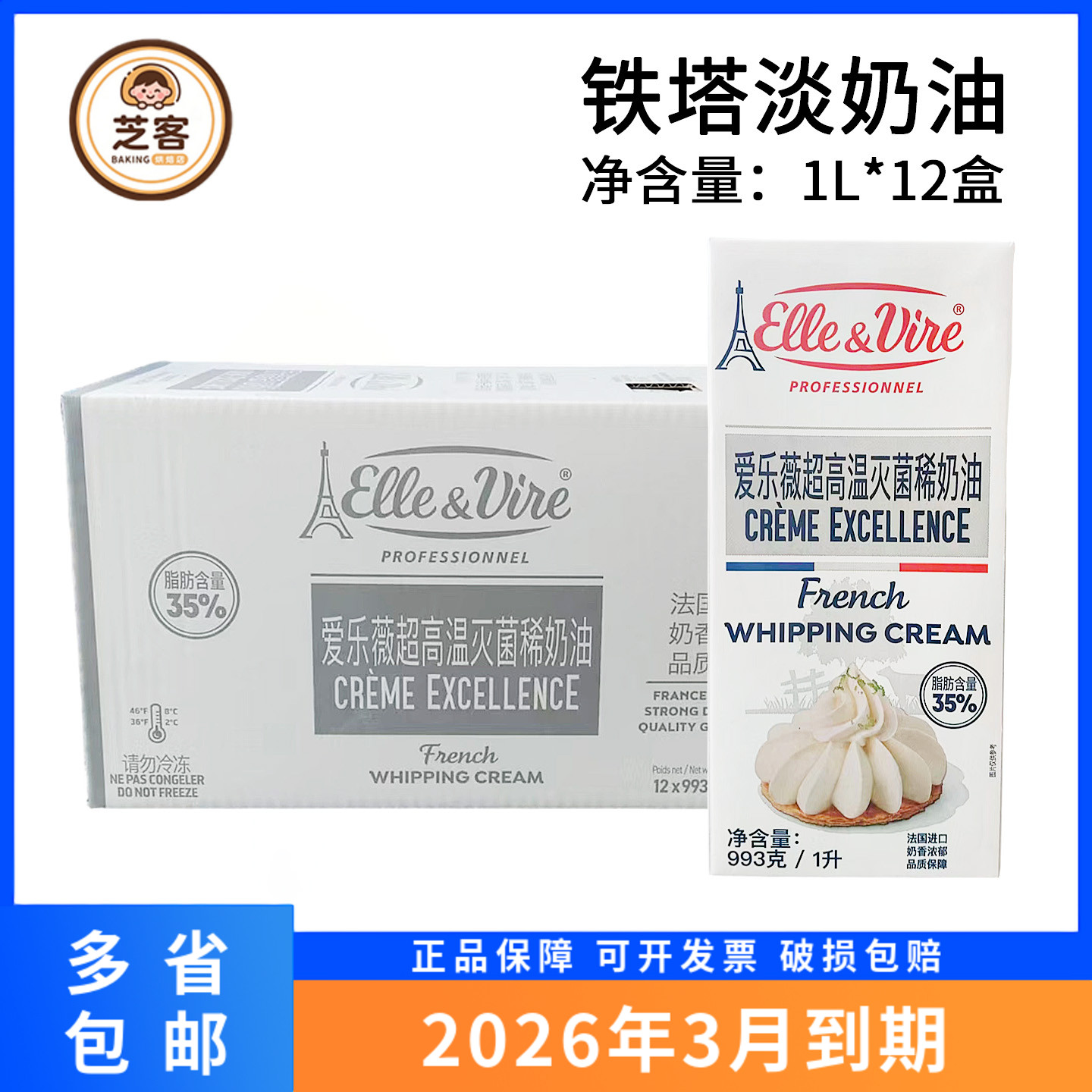 爱乐薇铁塔淡奶油1L*12盒法国进口动物性稀奶油商用裱花蛋糕烘焙