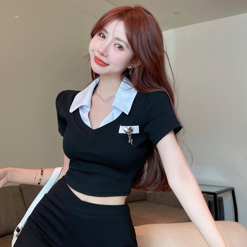 撞色翻领正肩短袖T恤女夏2024新款甜辣露脐修身收腰显瘦短款上衣