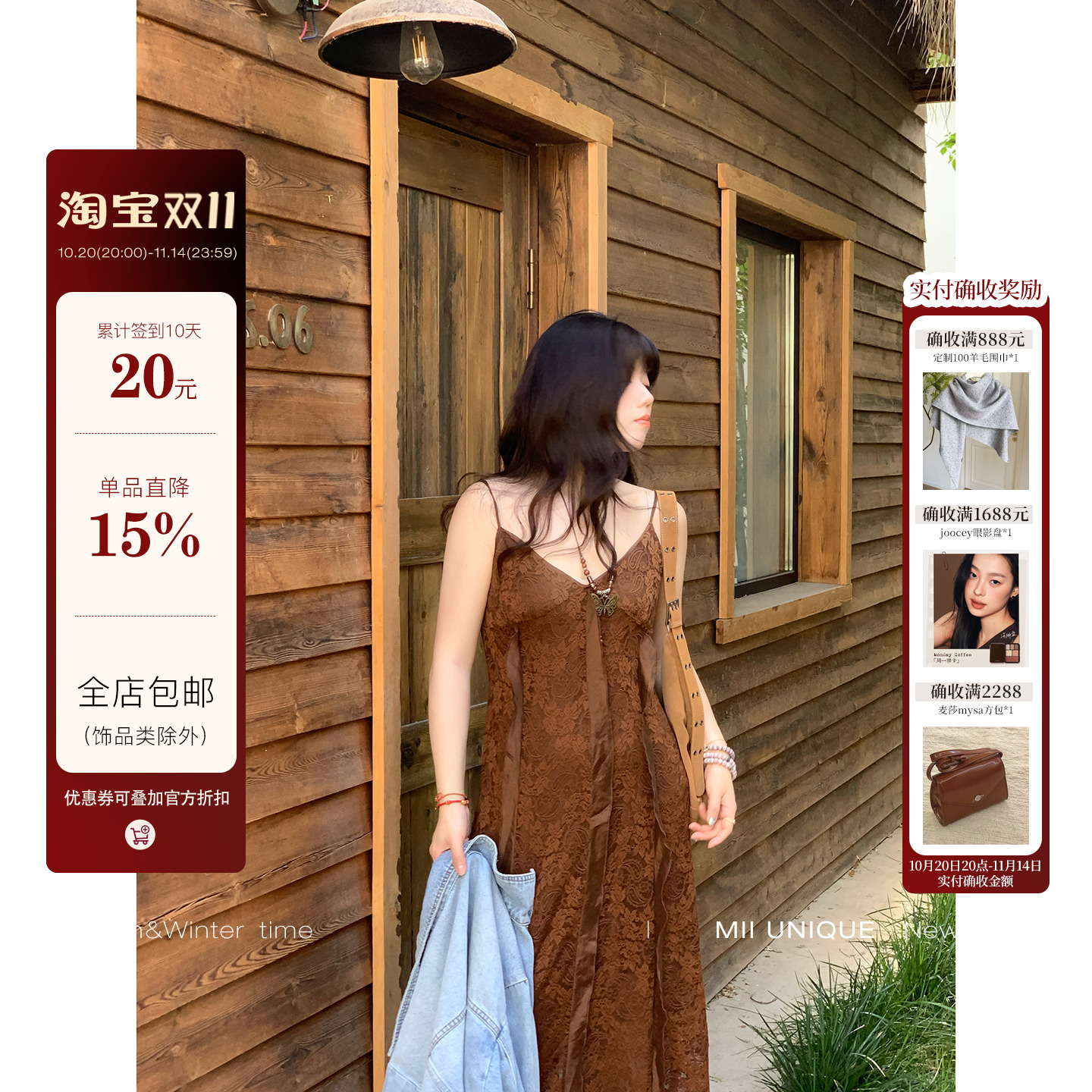 米米子微胖大码胖mm 纯欲时尚别致重工蕾丝花朵长款吊带连衣裙秋