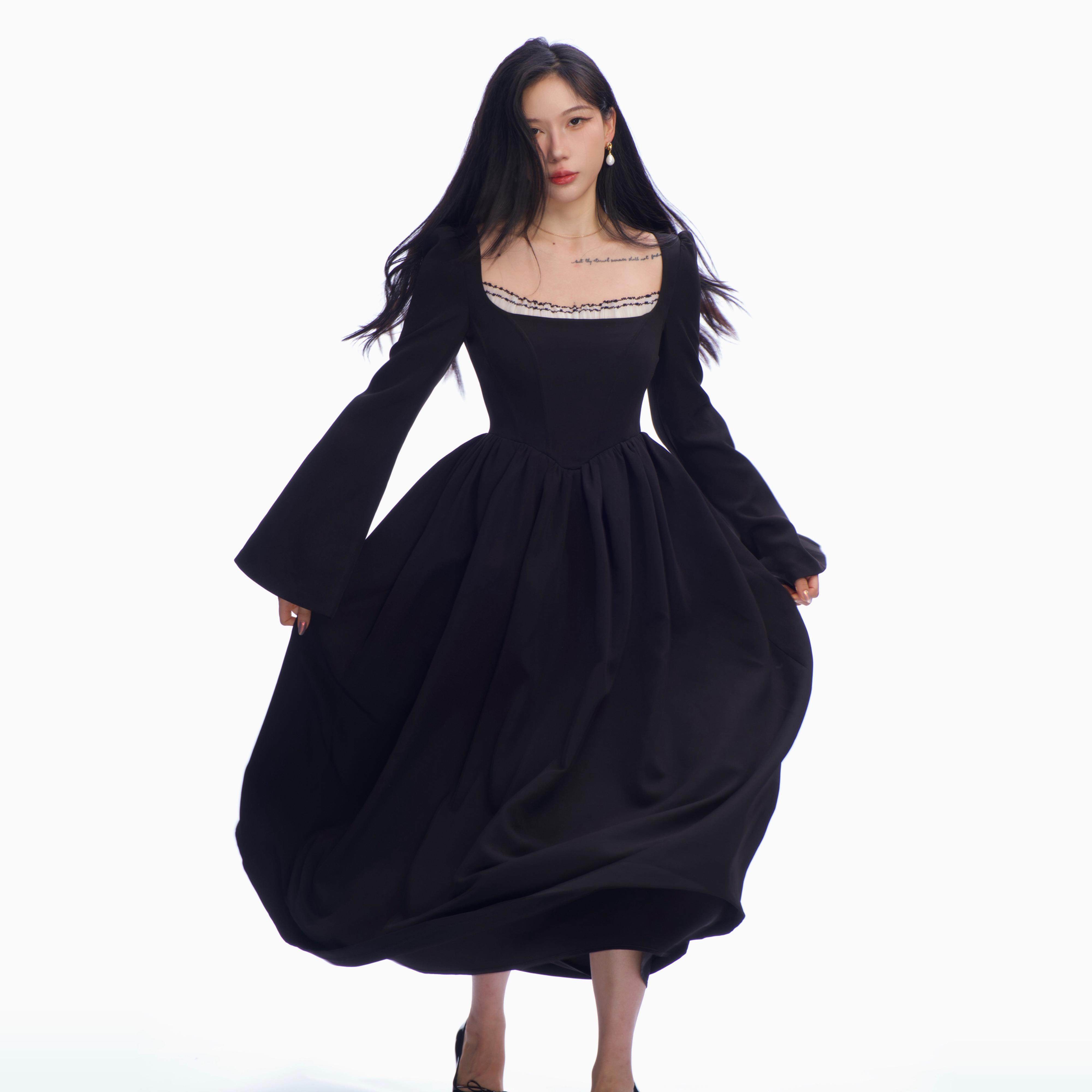 shemoda法式性感一字领抹胸挂脖飘带连衣裙女高腰修身过膝长裙子