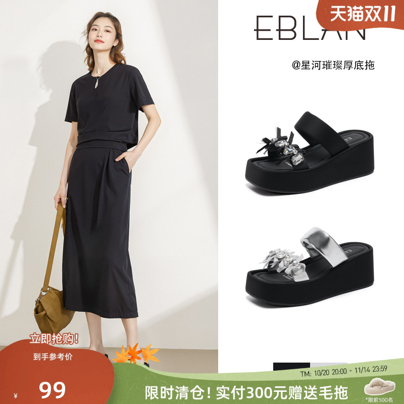 EBLAN/伊伴【99清仓福利】厚底坡跟拖鞋女外穿水钻蝴蝶结一字凉拖