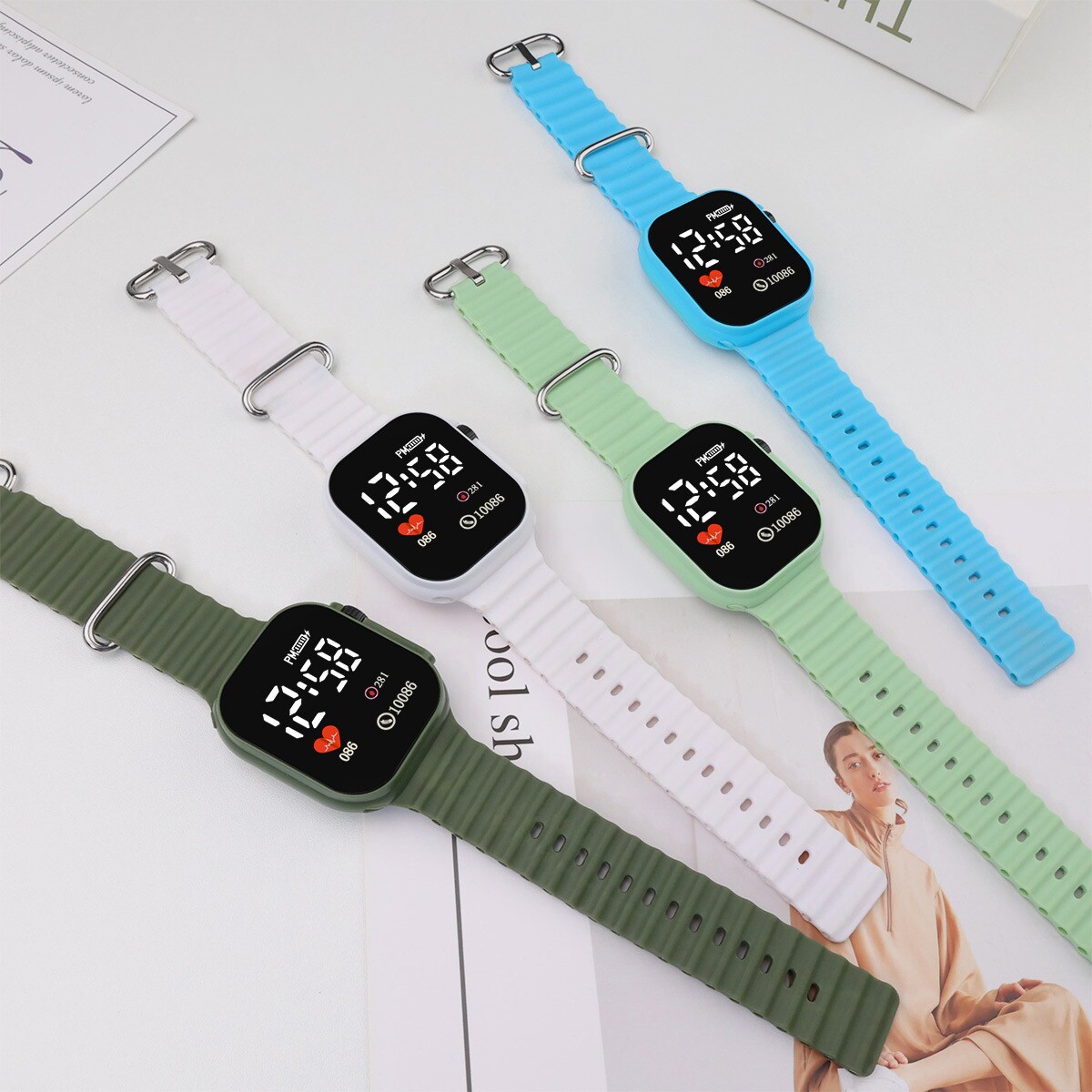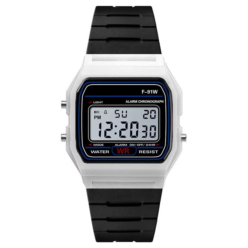 抹茶绿实色方块情侣LED电子手表多功能女中学生夜光防水款手表